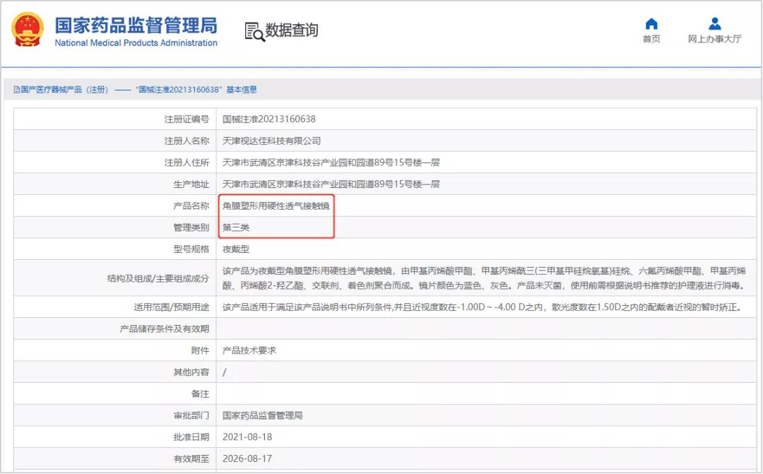 ——2021年8月18日,天津視達(dá)佳科技有限公司生產(chǎn)的產(chǎn)品“夜戴型角膜塑形用硬性透氣接觸鏡(ok鏡)”獲批國(guó)家藥監(jiān)局三類醫(yī)療器械注冊(cè)證(國(guó)械注準(zhǔn)20213160638),這也是國(guó)產(chǎn)的第三張角膜塑形鏡產(chǎn)品證書。