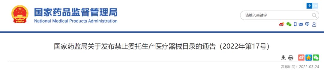 為加強(qiáng)醫(yī)療器械生產(chǎn)監(jiān)管,保障醫(yī)療器械安全、有效,根據(jù)《醫(yī)療器械監(jiān)督管理條例》(國務(wù)院令第739號),國家藥品監(jiān)督管理局組織修訂了《禁止委托生產(chǎn)醫(yī)療器械目錄》,現(xiàn)予發(fā)布,自2022年5月1日起施行,原國家食品藥品監(jiān)督管理總局《關(guān)于發(fā)布禁止委托生產(chǎn)醫(yī)療器械目錄的通告》(2014年第18號)同時廢止。特此通告。