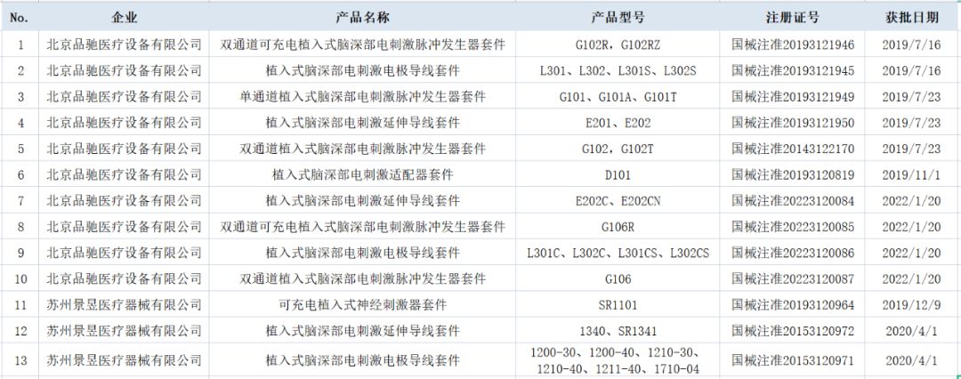 國(guó)內(nèi)已獲證的用于帕金森的腦起搏器產(chǎn)品(來(lái)源:NMPA)