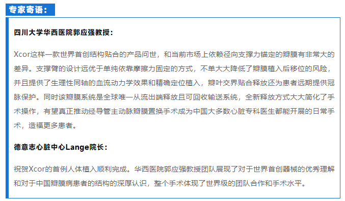 2022年5月20日,四川大學(xué)華西醫(yī)院郭應(yīng)強教授團隊成功應(yīng)用南京圣德醫(yī)療科技有限公司研制的帶結(jié)構(gòu)貼合錨定及全新釋放方式的自膨式TAVR產(chǎn)品Xcor,為一位外科高危高齡重度主動脈瓣狹窄合并中度關(guān)閉不全患者實施了經(jīng)導(dǎo)管主動脈瓣膜置換手術(shù)。該例手術(shù)也標志著,由四川大學(xué)華西醫(yī)院郭應(yīng)強教授牽頭的全國多中心研究正式起航。