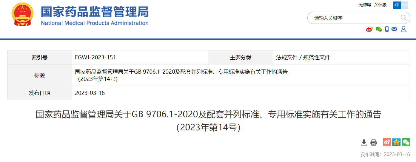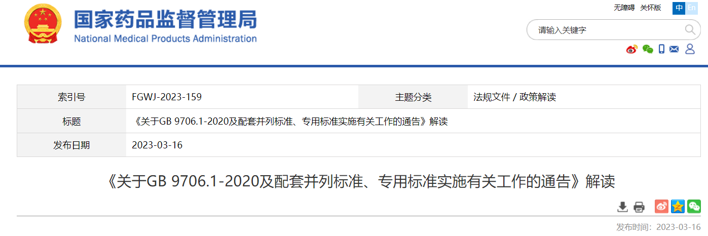 近日,國家藥監(jiān)局發(fā)布《關于GB 9706.1-2020及配套并列標準、專用標準實施有關工作的通告》(2023年第14號,以下簡稱通告)?,F(xiàn)就通告出臺的背景、相關內(nèi)容說明如下: