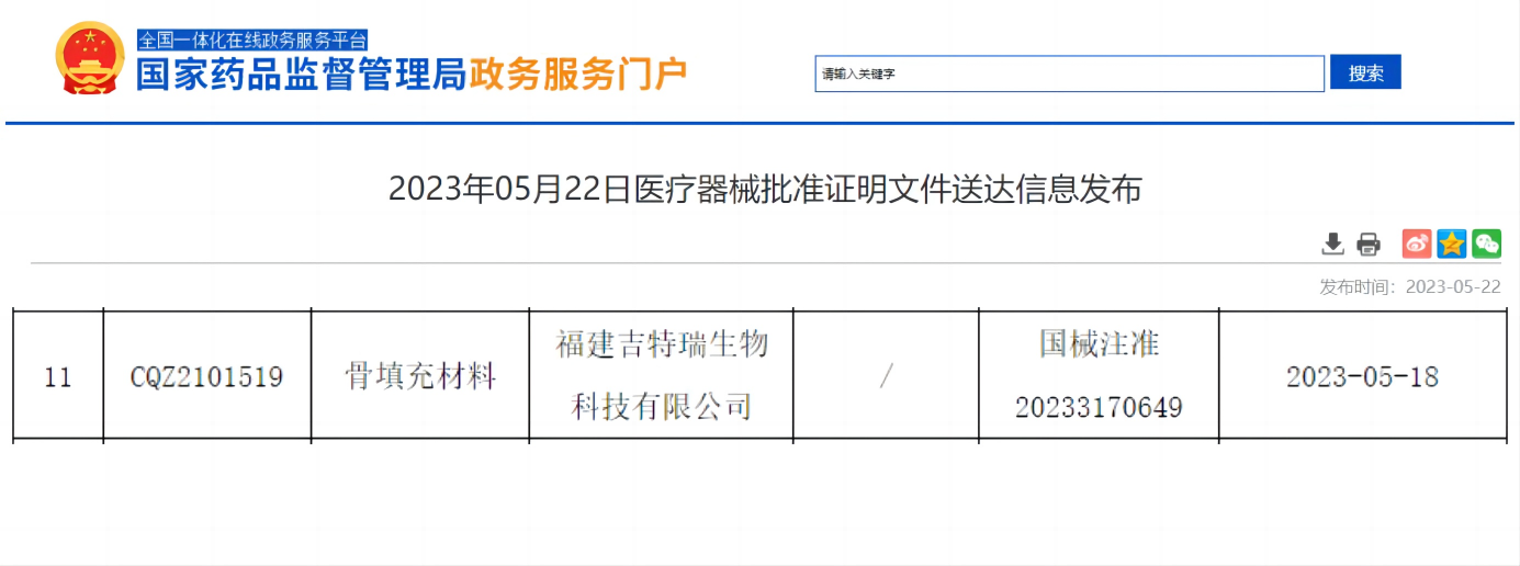 「MA成果發(fā)布」福建吉特瑞·骨填充材料獲證——2023年「第9張」三類醫(yī)療器械注冊證???MA成果發(fā)布