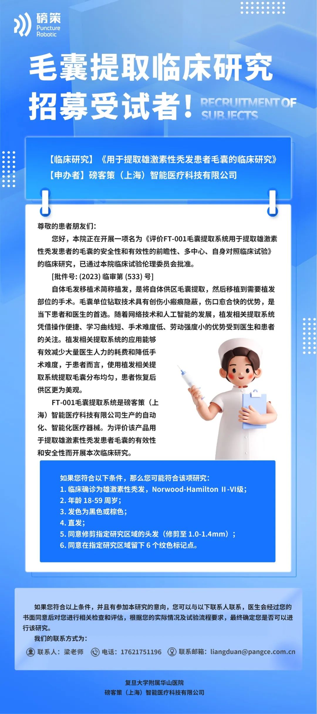 近期,由磅客策 (上海)智能醫(yī)療科技有限公司研發(fā)的磅策植發(fā)機器人在上海成功召開臨床試驗啟動會暨人工智能毛發(fā)創(chuàng)新中心落成典禮,奧泰康負責臨床試驗服務(wù)。