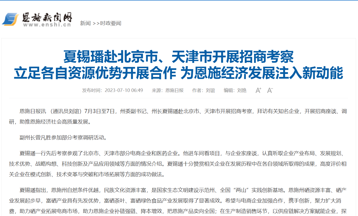 7月,恩施州州委副書記、州長夏錫璠,副州長曾凡勝,州政府秘書長程飛一行蒞臨奧泰康北京總部考察調(diào)研,奧泰康期待借助自身CRO在醫(yī)藥科技成果轉(zhuǎn)化方面的豐富經(jīng)驗與優(yōu)勢,助力恩施州傳統(tǒng)中醫(yī)藥和硒產(chǎn)品的新藥科技成果轉(zhuǎn)化,實現(xiàn)優(yōu)勢互補、資源共享、共同推動生物醫(yī)藥行業(yè)高質(zhì)量發(fā)展。