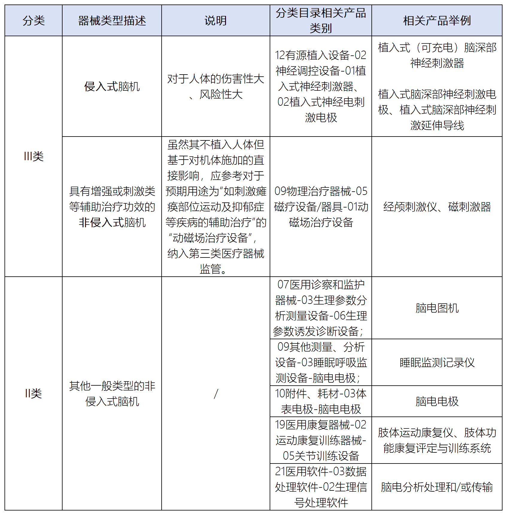 中國器審發(fā)布的《腦機接口的監(jiān)管現(xiàn)狀》指出,由于III類醫(yī)療器械在注冊難度、監(jiān)管要求、申請受理部門層級和申請時長等方面都遠高于II類醫(yī)療器械,我國腦機企業(yè)目前大多選擇非侵入式采集技術(shù)路線。對于侵入式腦機設備,目前都處在臨床性研究和動物實驗階段。目前暫無公開性的由國家藥品監(jiān)督管理局正式批準進入人體臨床試驗階段的侵入式腦機器械。根據(jù)廣義BCI的定義,結(jié)合我國現(xiàn)行《醫(yī)療器械分類目錄》的規(guī)定,與BCI相關設備的分類主要為II類和III類: