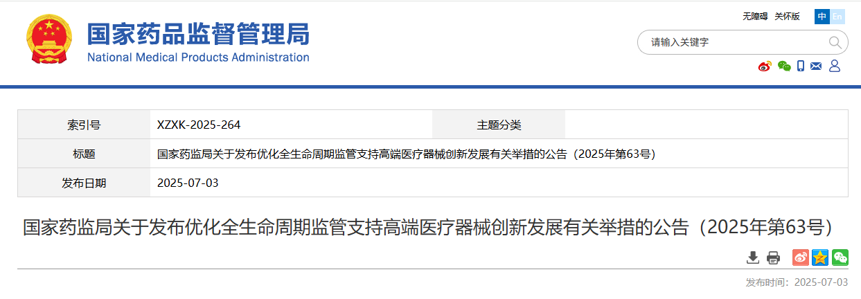 國家藥監(jiān)局關(guān)于發(fā)布優(yōu)化全生命周期監(jiān)管支持「高端醫(yī)療器械」創(chuàng)新發(fā)展有關(guān)舉措的公告(2025年第63號)醫(yī)用機器人、高端醫(yī)學(xué)影像設(shè)備、人工智能醫(yī)療器械和新型生物材料醫(yī)療器械等(以下簡稱高端醫(yī)療器械)是塑造醫(yī)療器械新質(zhì)生產(chǎn)力的關(guān)鍵領(lǐng)域。為深入貫徹黨的二十屆三中全會精神,落實《國務(wù)院辦公廳關(guān)于全面深化藥品醫(yī)療器械監(jiān)管改革促進醫(yī)藥產(chǎn)業(yè)高質(zhì)量發(fā)展的意見》(國辦發(fā)〔2024〕53號)要求,完善審評審批機制,加強全生命周期監(jiān)管,全力支持高端醫(yī)療器械重大創(chuàng)新,促進更多新技術(shù)、新材料、新工藝和新方法應(yīng)用于醫(yī)療健康領(lǐng)域,更好滿足人民群眾健康需求,提升我國高端醫(yī)療器械國際競爭力,國家藥監(jiān)局提出以下支持舉措。